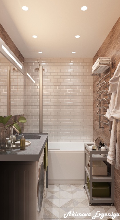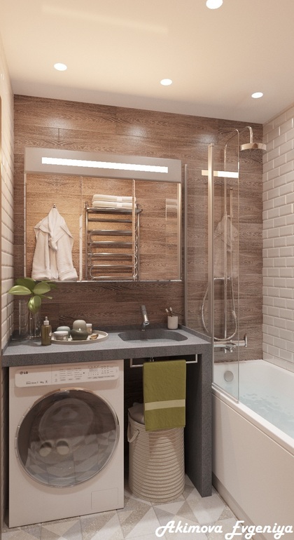 Интерьерное решение ванной комнатыДумаю, саму ванну ставить по горизонтали или по вертикали. Хочу ещё стиральную машинку впихнуть так, чтобы она не мешала и был свободный проход к умывальнику