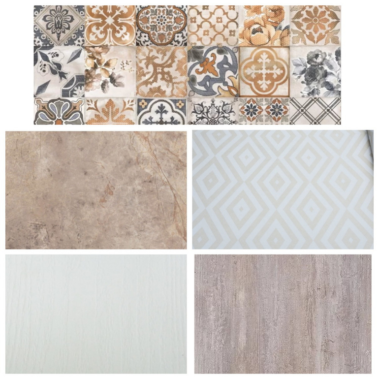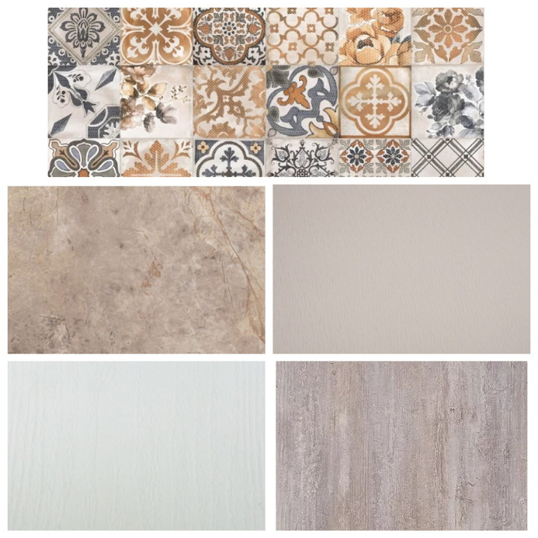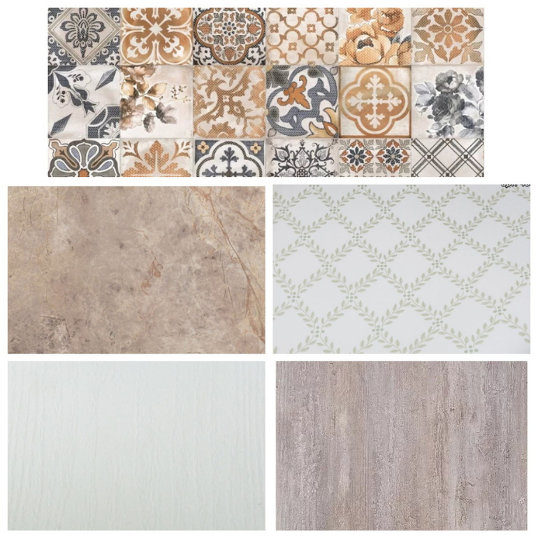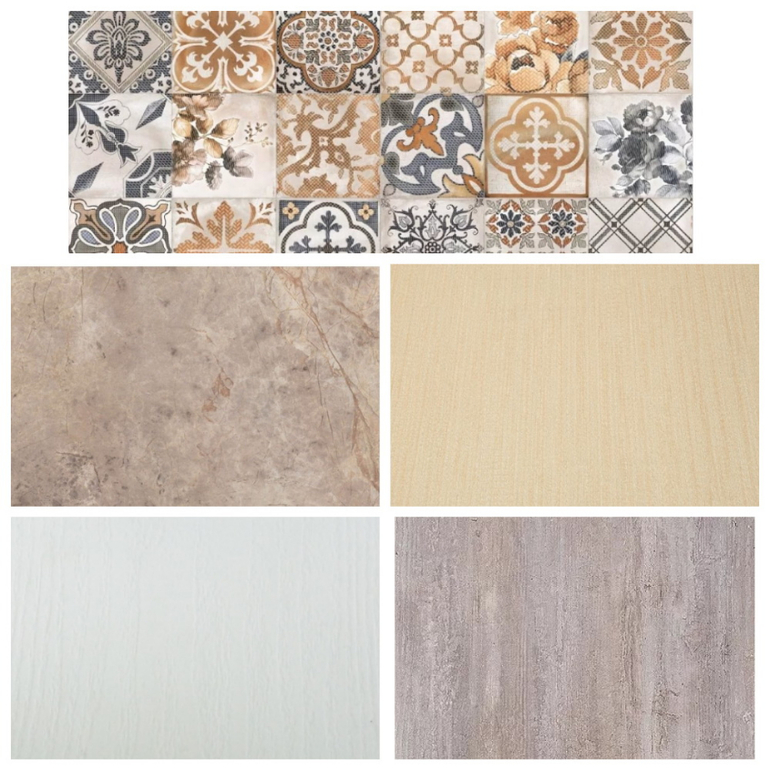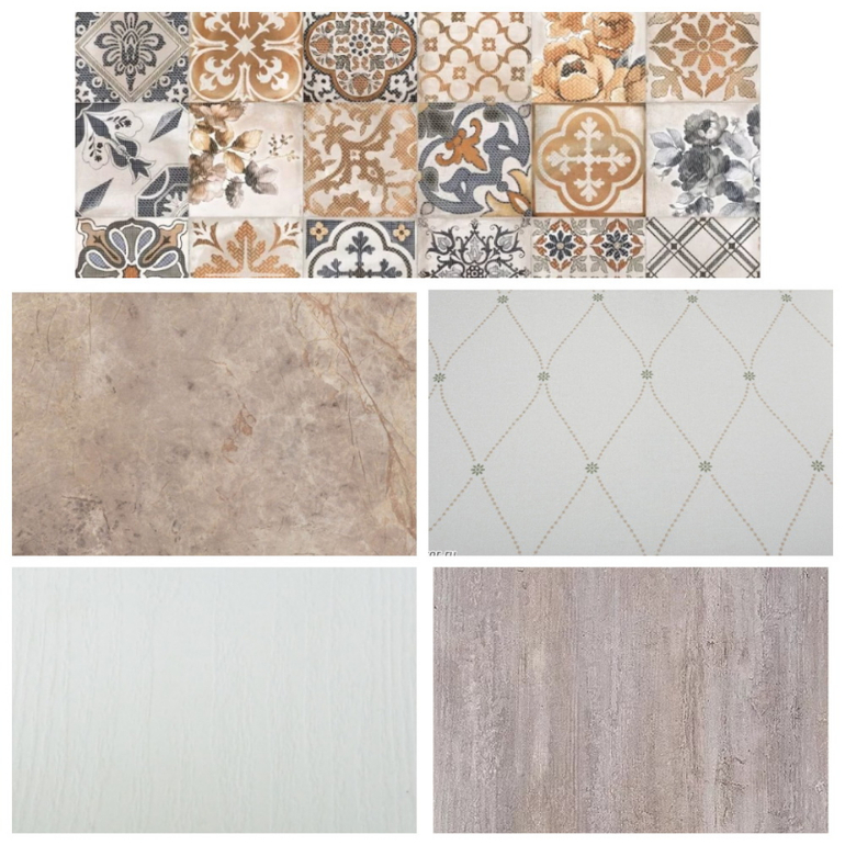 Изначально тоже хотела выделить противоположную гарнитуру стену обоями с акцентом, но потом подумала, что активные элементы декора на фартуке+на обоях уже перебор. Поэтому решили остановиться или на однотонных, или с самым простым орнаментом/мелким рисунком. С цветом обоев тоже засада - бежевые, голубые, что-то оливко-фисташковое?? Я сделала несколько коллажей, какие варианты, на ваш взгдяд, удачнее, а может что-то еще предложите?