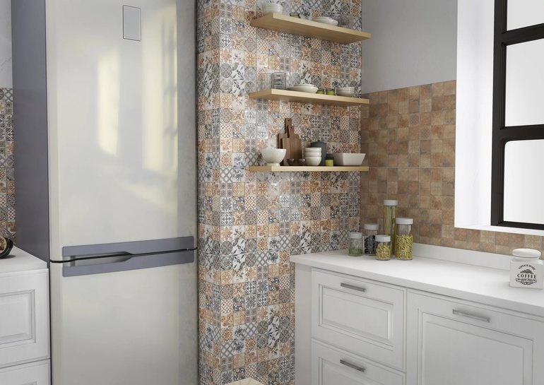 Имеем: кухня 7 кв. м. с вент. коробом. Заказали гарнитур (фото проекта ниже) фасады - белое дерево, столешня - клермон (под камень). Определились с покрытием на пол - по цвету практически совпадает со столешней. Фартук планируем положить из плитки LASSELSBERGER Сиена - бежевой, но зону между плитой и вытяжкой, а также вент.короб - выделить декором.