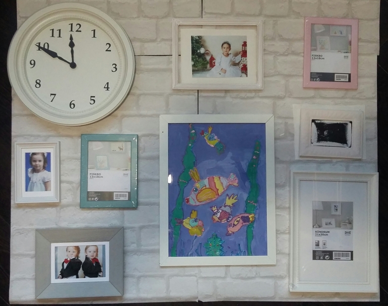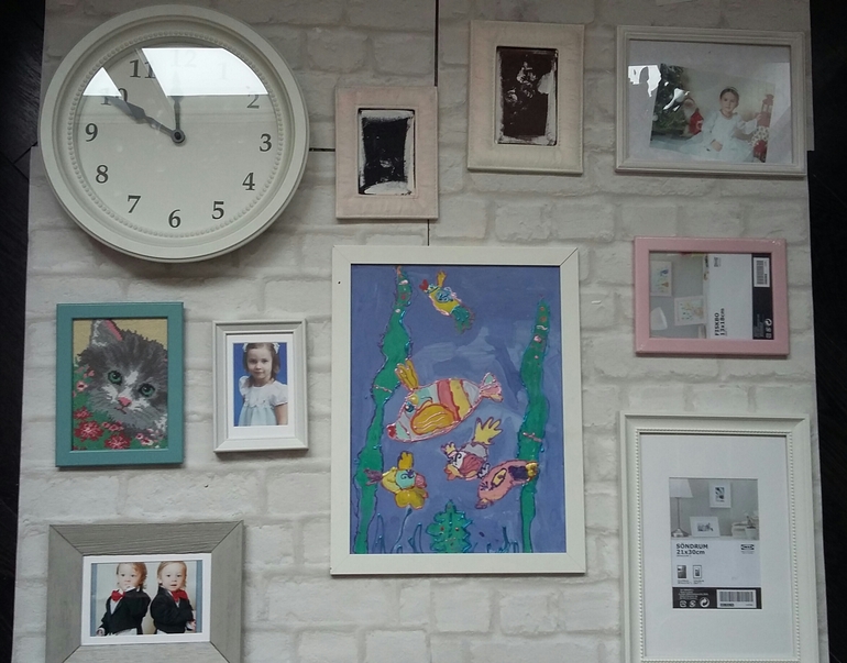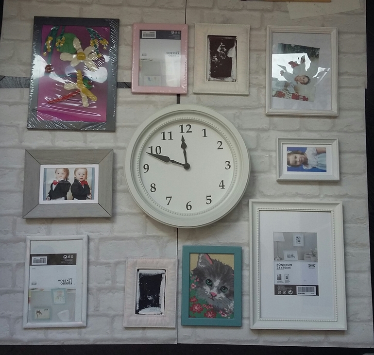 по мне третий вариант почти))) нижнюю левую я бы переместила левее, чтобы в общем, со всеми рамками, получился правильный прямоугольник. и часы в углу мне больше нравятся. Попробуй еще на полу положить часы в верхний левый и рамки по диагонали в два ряда, а в нижнем правом последнюю рамку.