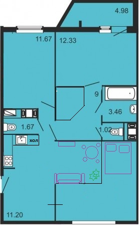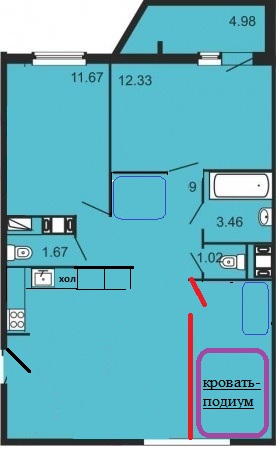 В голубом варианте в правой верхней комнате можно прям по балконному блоку отделить узкую маленькую спальню с выходом на балкон, остальные стены между кухней и комнатой, и коридором снести и получится кухня-гостиная)
