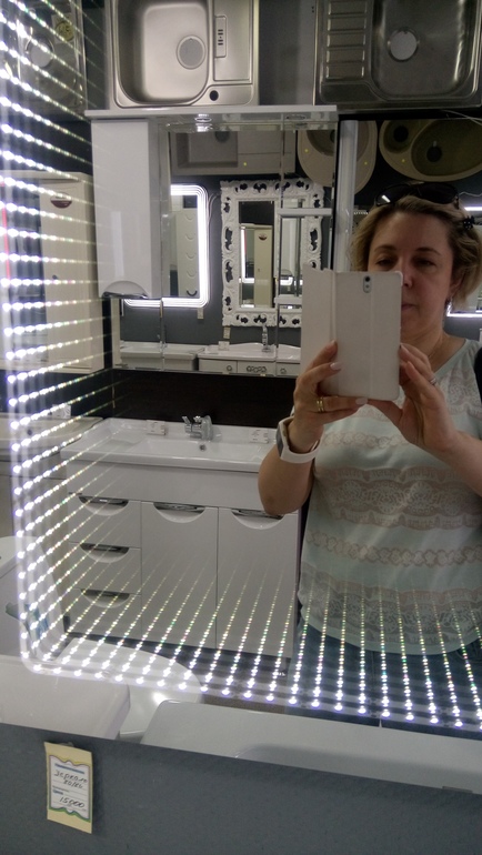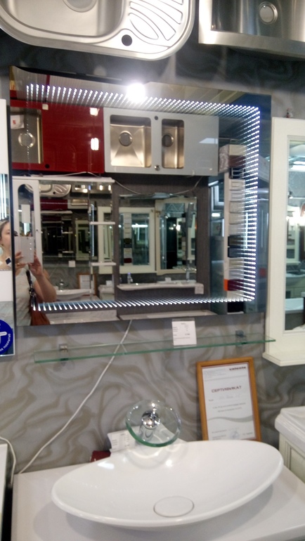 Там расстояние между стеклом и зеркалом.. Все красиво, но зеркало в ванной мне с практичной стороны важнее))). Выбираю с подогревом, чтоб Не потело. Да и продавцу поверила)