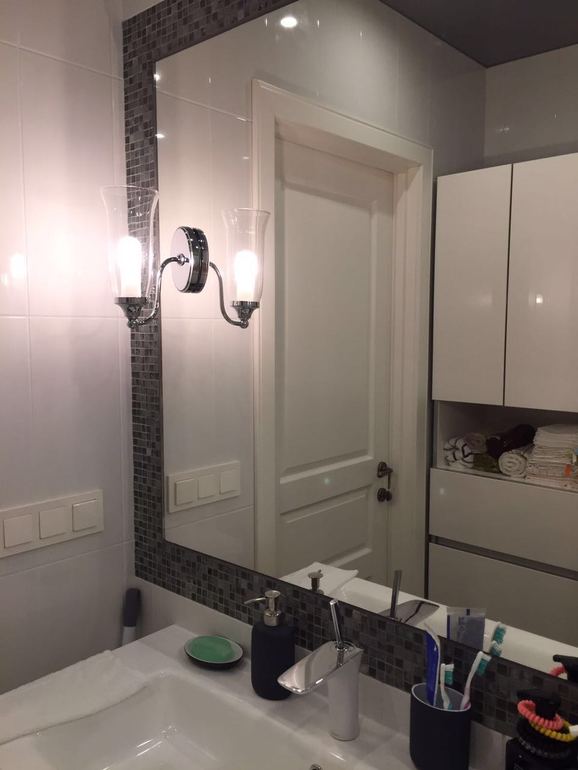 Зеркало встроено заподлицо с плиткой + под ним идет подогрев, чтобы не запотевало. По периметру идет красивая, дорогая мозаика от Атлас Конкорда. В ней есть и шоколадные и серые оттенки + перламутр. Но, т.к. ее использовано меньше квадратного метра - хозяева решили, что бюджет ее потянет.