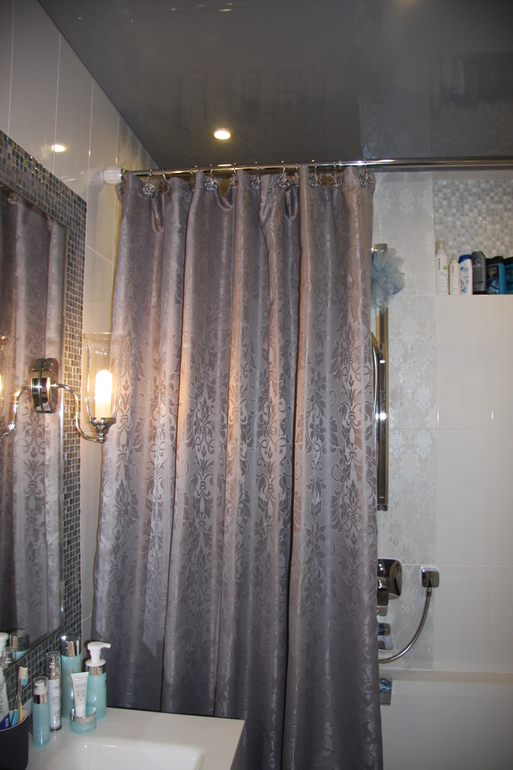 Основная плитка Атлас Конкорде серия Desire, мозаика вокруг зеркала Атлас Конкорд Royale Mosaico, светлая мозаика недорогая китайская Natural Mosaic (коллекцию не помню). Шторку заказчица нашла самостоятельно на просторах интернета.