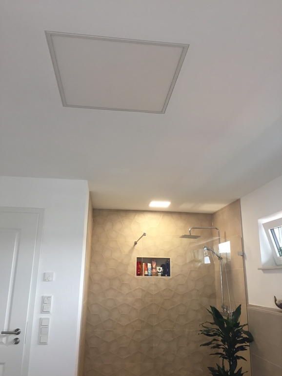 Даже очень практичны- брызги воды не попадают. Для самой ванной лампа размером 50х50 см., а для душа сделали поменьше размером 30х30см.- отдельные выключатели. Смотрите