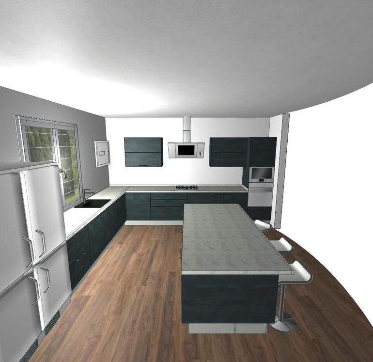 Пожалуйста))) Увас разделены зоны приготовления (гарнитур углом) и островная зрна(обеденная). Это смотрится очень хорошо, но не хватает дополнительных элементов, на потолке, например, это светильники над островом, и отдельно подсветка по периметру гарнитура, может быть 2 уровня потолка и скрытая подсветка ниши, даже можно с цветом подумать, над островом, чтобы выделить его, потому что здесь он- центральная фигура.Примерно так, это как я вижу, конечно)))