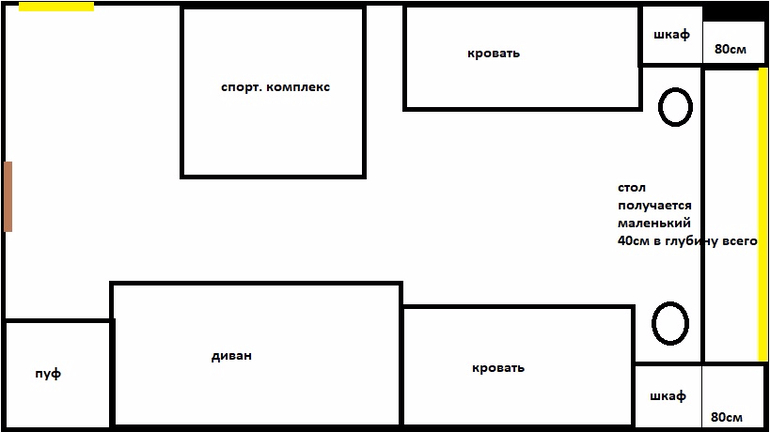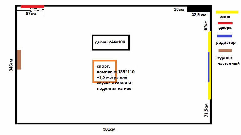 Интерьерное решение детской комнатыКомната для двух деток малышей, размером 581х346см, Уже имеется диван 244х100см,пуфик 67х67см , турник на стене, компьютерный стол 115х69 см (им можно пренебреч) и детский спортивный комплекс 135х110 + нужно место метра 1,5 чтобы можно было туда залезать и скатываться с горки. Детская,либо с 1 двухъярусной кроватью 200х90см,либо с двумя 190х80,предпочтительнее 2 конечно) Так же нужны стеллажи для книг/игрушек и шкаф для одежды. Ну и рабочая поверхность для рисования,лепки,далее для домашнего задания и компьютеров. мой вариант прилагаю,но мне он не очень нравится т,к стол не глубокий совсем получается,и места в комнате мало остается свободного,чтобы поиграть. Шкафы я тут разделяю на 2 части закрытая для вещей и стеллаж для игрушек и книг,который переходит в столешницу. Буду очень благодарна за помощь в планировании детской. Черненькое пятно на рисунке это стена шахты.из-за которой нормально ничего не спланировать.