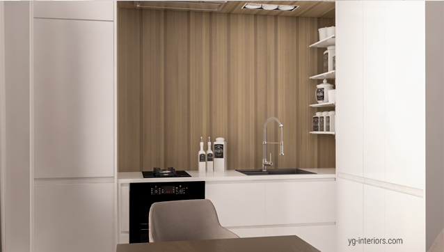 Места для готовки маловато, но заказчица очень мало готовит и приоритетом в данной кухне был внешний вид.