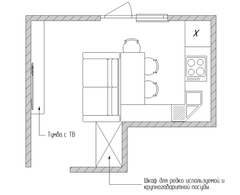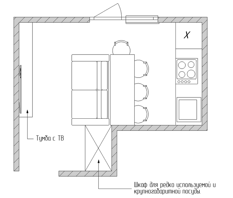 Ну, Вы просто поставьте стул или кресло на это же место, сядьте, и посмотрите на стену)))) если комфортно, то вариант Ярославны очень интересный) у меня, кстати, очень похожая кухня, и тоже думаю, куда диванчик небольшой, но удобный впихнуть с ТВ))