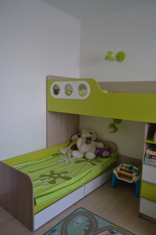 Кровать взяли в 2 яруса, старший естественно наверху, мелкий переедет в комнату только зимой, пока еще маловат. Над каждой кроватью свой ночник.