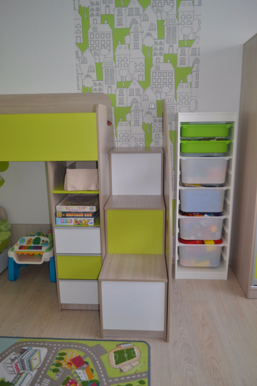 Лестницу специально брали большими ступенями тк все-таки она гораздо удобнее и безопаснее. Но минус для нас оказался в том, что маленький годовалый скалолаз с легкостью туда залазит.