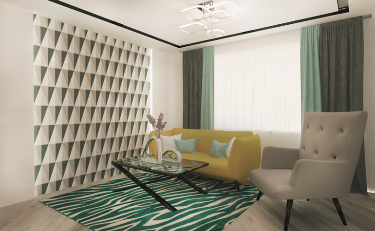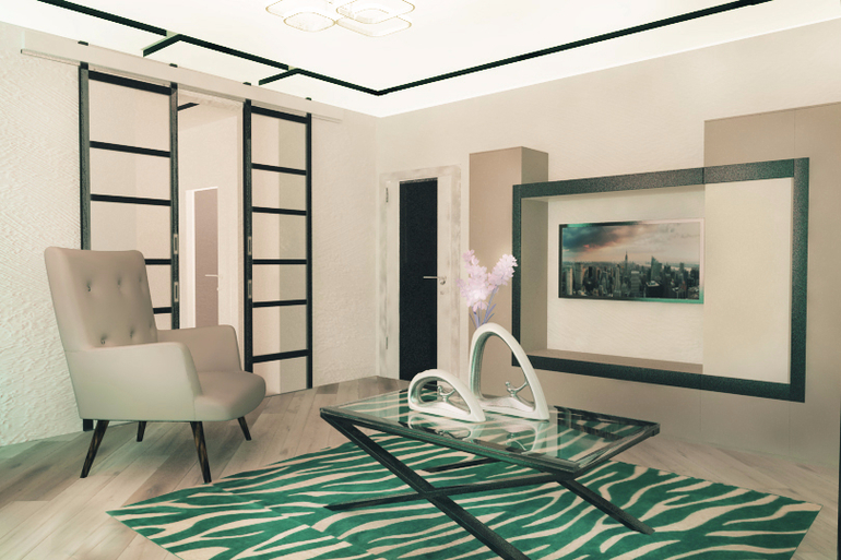 Гостиная-яркая и контрастная, главные акценты-панно Cole & son на стене и ковер с животным принтом. Мебель легкая и компактная, но при этом есть хорошая зона для хранения (вокруг тв).
