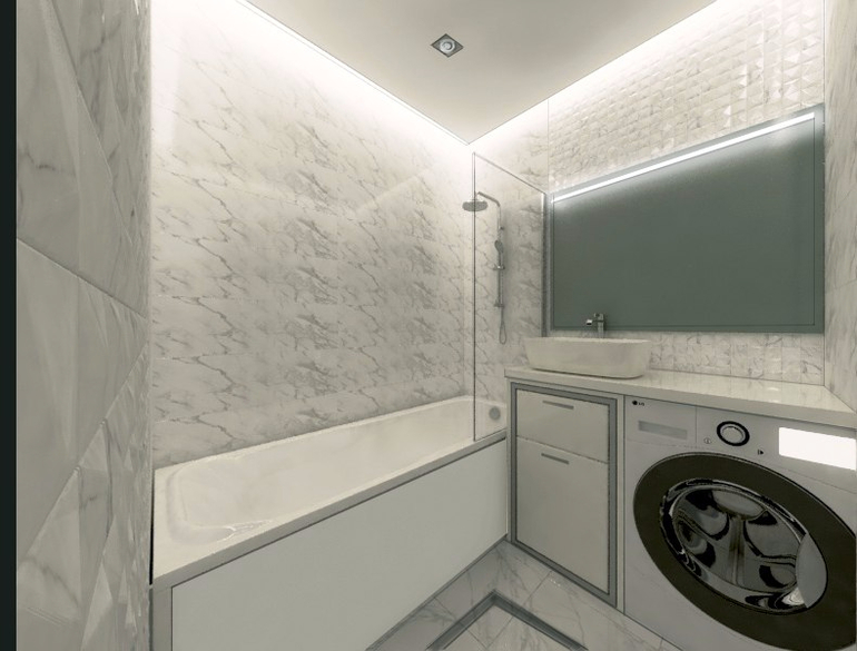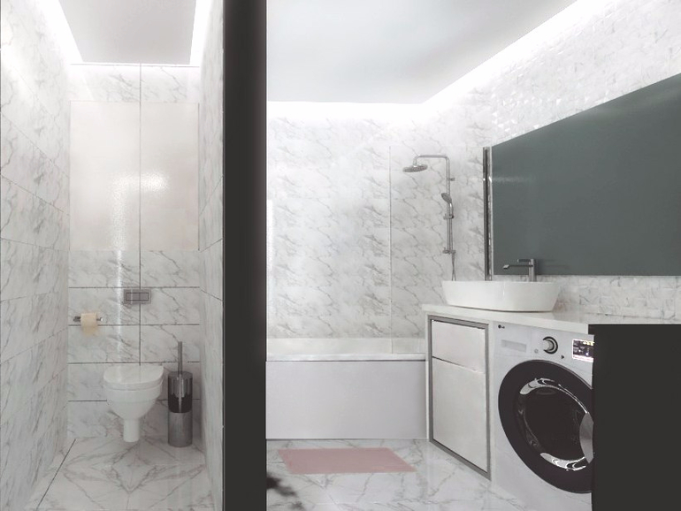 При проектировании санузлов мы старались максимально комфортно разместить зону раковины,уместить стиральную машину, раковину и шкаф для хранения, при этом не потеряв столь ценного пространства. Раковина смещена левее от стиральной машины. что позволяет без проблем установить сифон и вывести воду,не мешая стиральной машине. Главное соблюсти все необходимые правила, размеры и параметры. Плитка, имитирующая текстуру мрамора, не требует дополнительного декора, поэтому мы показали ее в простом исполнении,слегка разбавив ненавязчивой мозаикой в зоне зеркала.