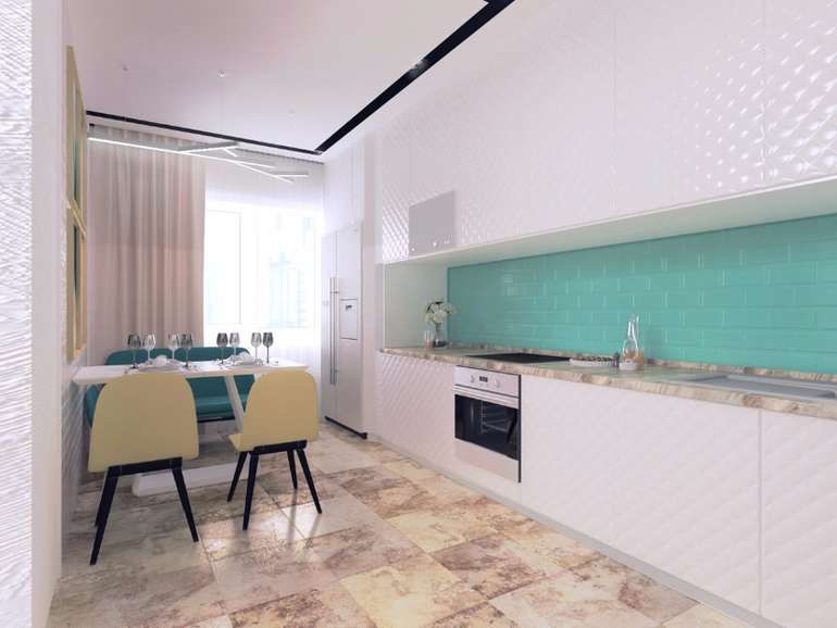 Для кухни были выбраны оригинальные фасады,которые дополняют рисунок настенной плитки в зоне стола, а прямая планировка гарнитйра сохранила много свободного места, при этом задала активную стену и вместила в себя все необходимое.