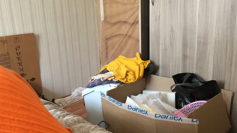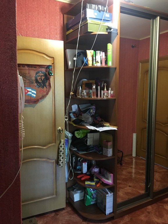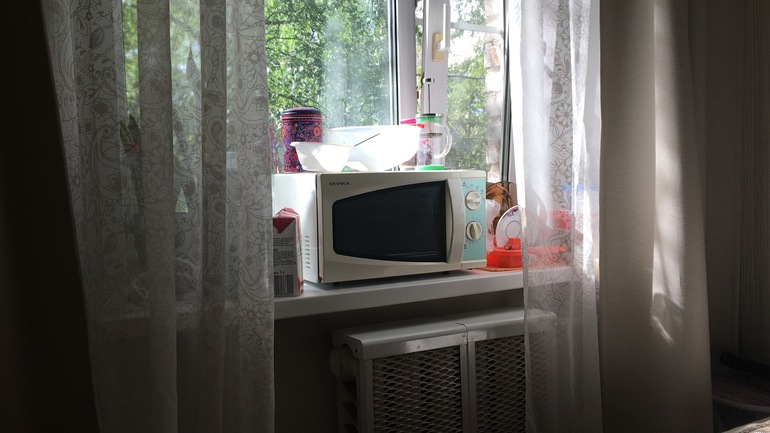 Мы жили в спальне, в которой у нас только кровать и шкаф. Спальня 7,8 метра! На окно поставили микроволновку. Питались чем придется. Фото с левой стороны кровати: