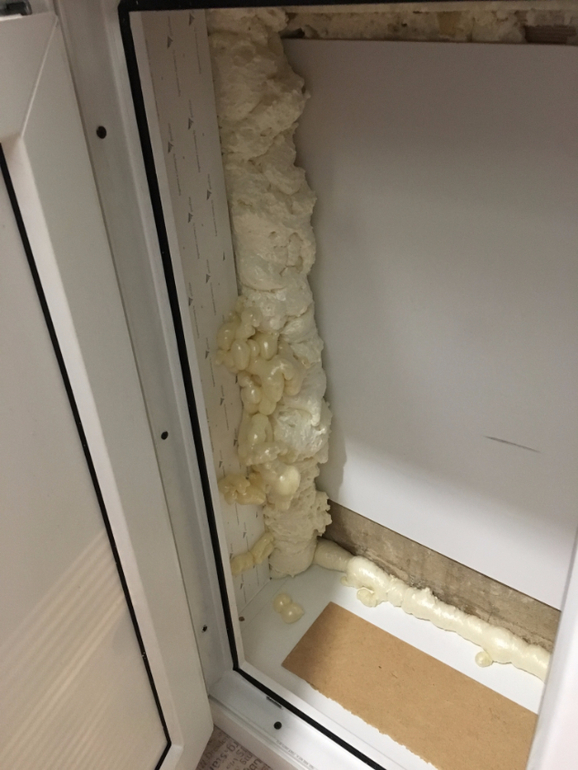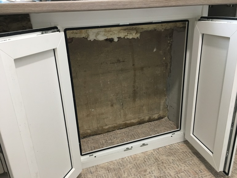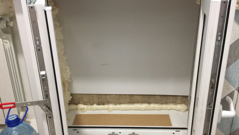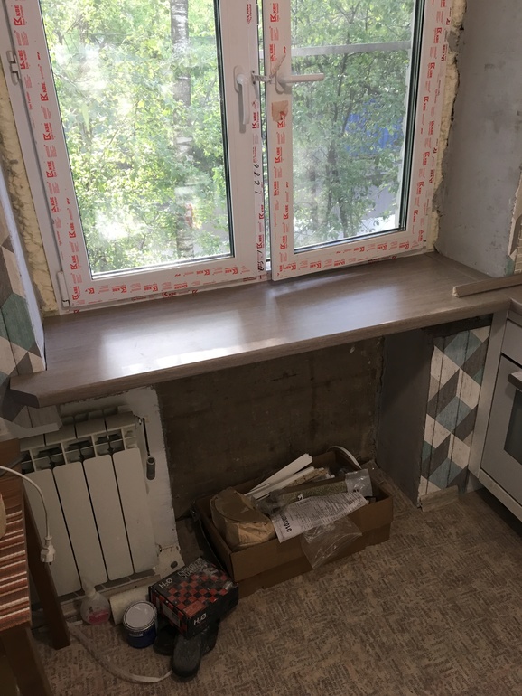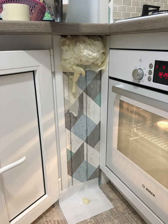 С горем пополам мы его сделали, вот по бокам у нас были дыры, пришлось запенивать и ставить досочки, благо от кухни остались: