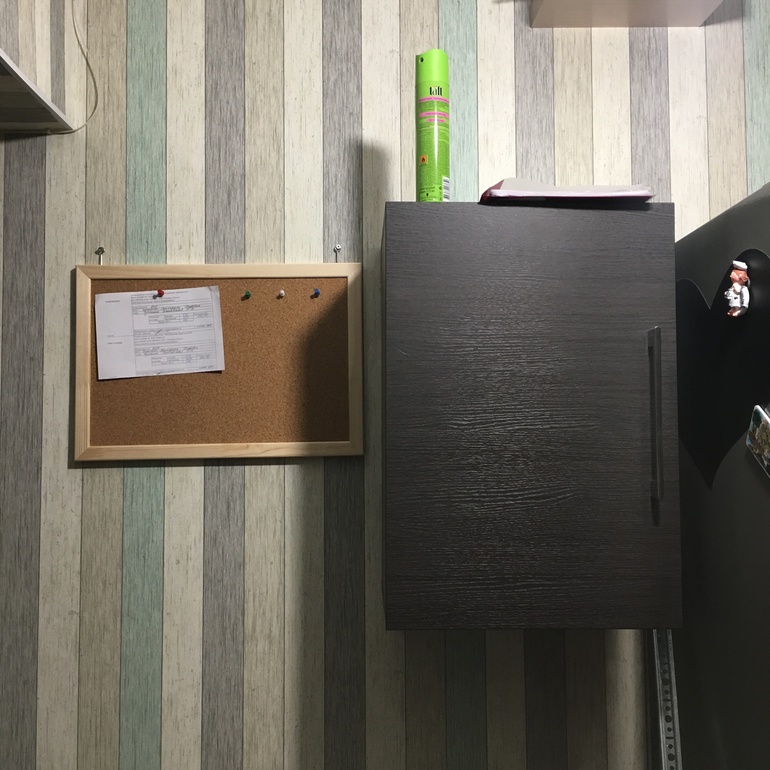 это чуть позже повесили шкафчик и доску пробковую, т.к. места хранения у нас стало гораздо меньше, а хранить где-то надо..