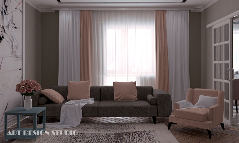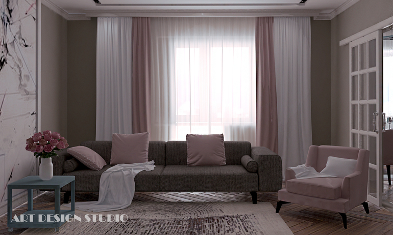Авторские проекты дизайнеров.(Посты не по теме будут удаляться!)Нежная гостиная в 2-комнатной квартире 60 кв. м. для молодой девушки. Сделали в двух близких цветовых решениях.