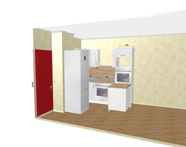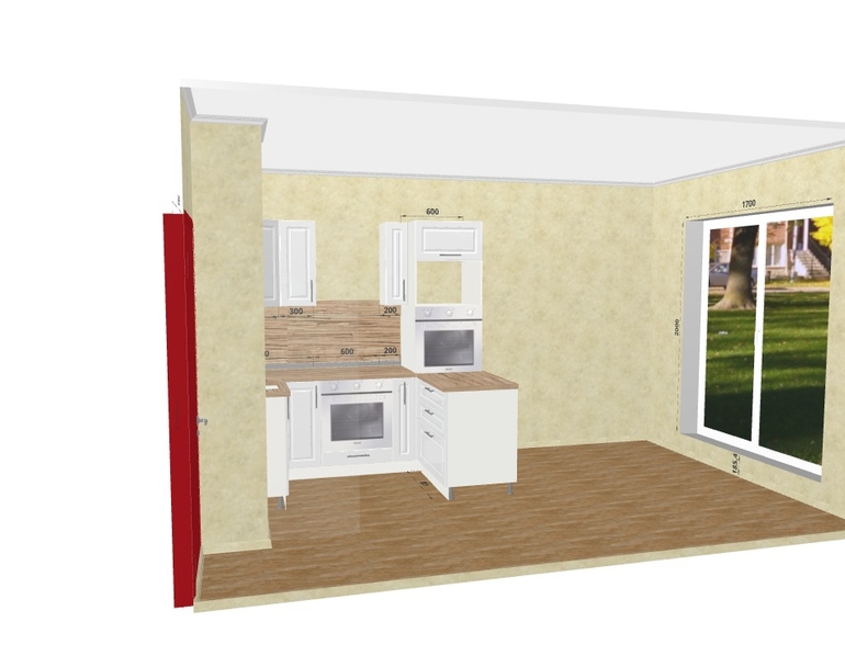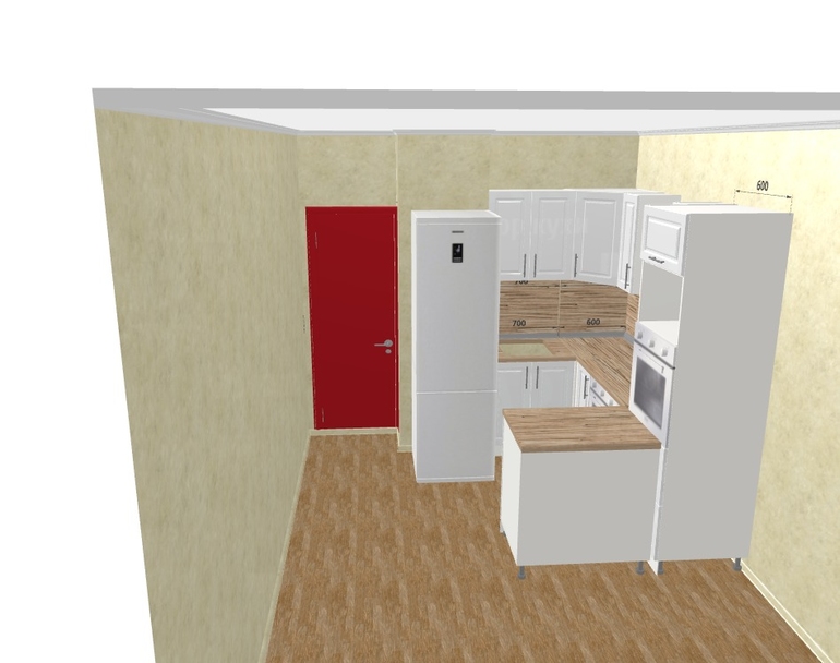 Угловой думаю сделать не больше 2.5 метров + холодильник (в центре стены получается), разделяющий зону готовки от обеденной. Но как "обыграть" венткороб?