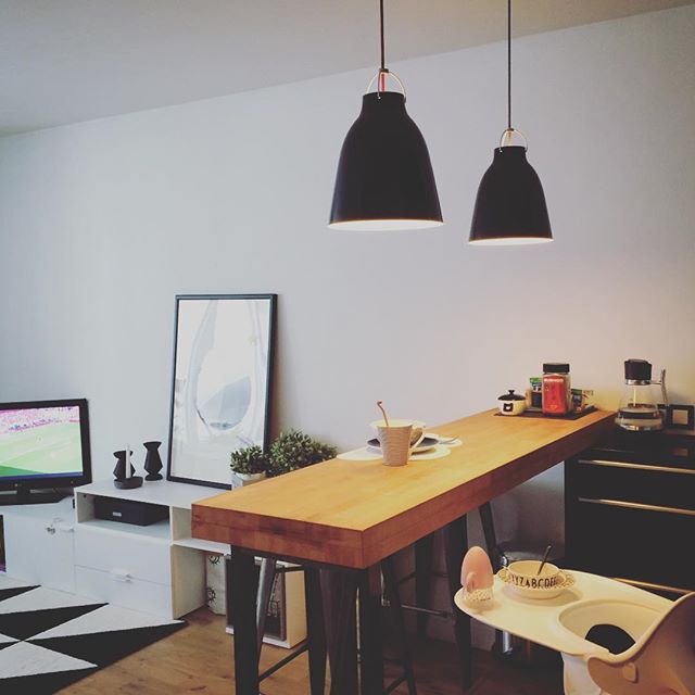 Над стойкой два подвеса, очень активные, лаковые (планирую заменить на такие же в серой матовой отделке, будут поспокойнее, и тем не менее - два крупных колпака на уровне глаз)