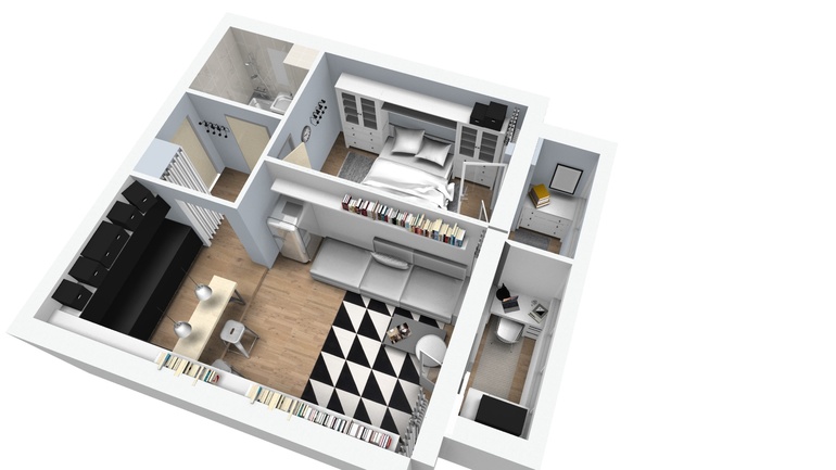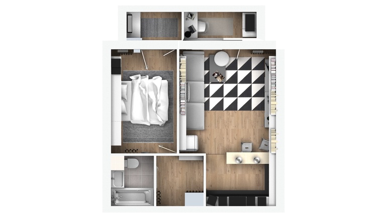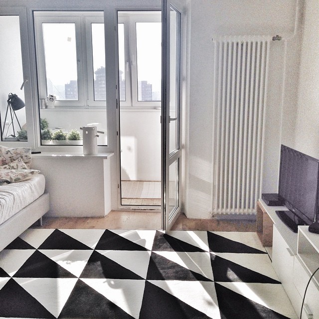 Поэтому снова перетягивать внимание на центр комнаты - не вариант. Долго пытались от этого уйти и переместить перспективу на балкон.
