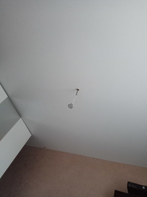 Ровно по центру потолка (даже чуть ближе к кухне, чем к балкону) торчит провод. Где-то по кромке ковра на плане: