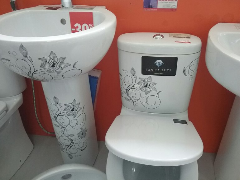 Второй вопрос. Уже купили такой унитаз и раковину. В каком стиле брать плитку (цвета, фактуры и тп). Есть мысль выложить нишу в ванной (где стиралка) мозаикой (красной, черной, бело-черной, стальной?)