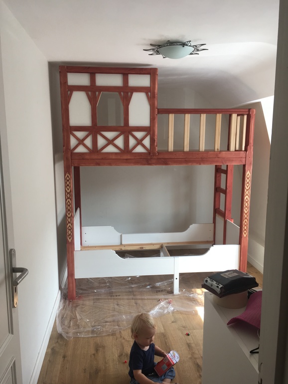 Какая потрясающая красота! У вас муж нереальный умелец! Ещё и декор вырезал по столбам! Супер!!! А вверху будет спальное место или игровой домик?