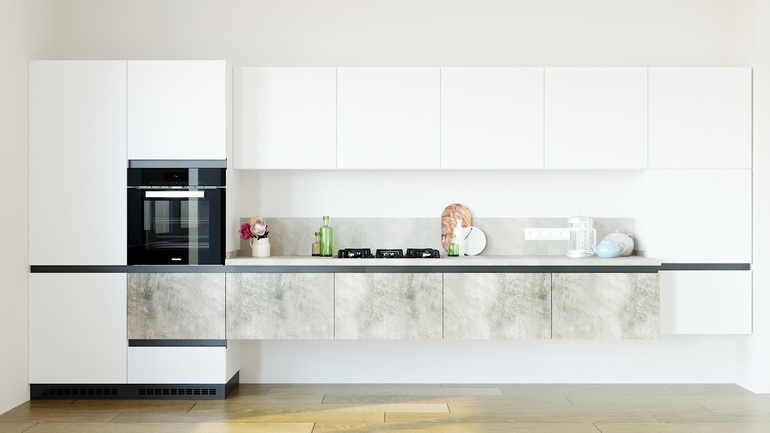 Я бы нижний ящик под духовкой сделала без ручки интегрированной,а на толкателе,чтоб эта ручка шла только по верху