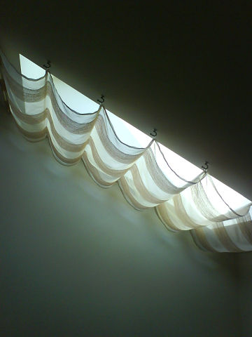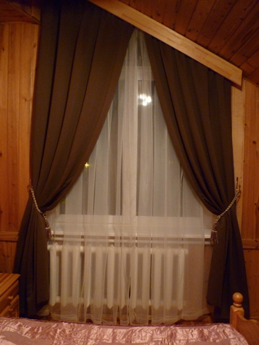 А здесь вообще карниза нет. Я делала планку под липу вместо карниза и, чего проще, повесила кисию. Ну, а поскольку была необходимость закрываться от фонаря и луны, то сделали стационарные с буфами на мягкой липе
