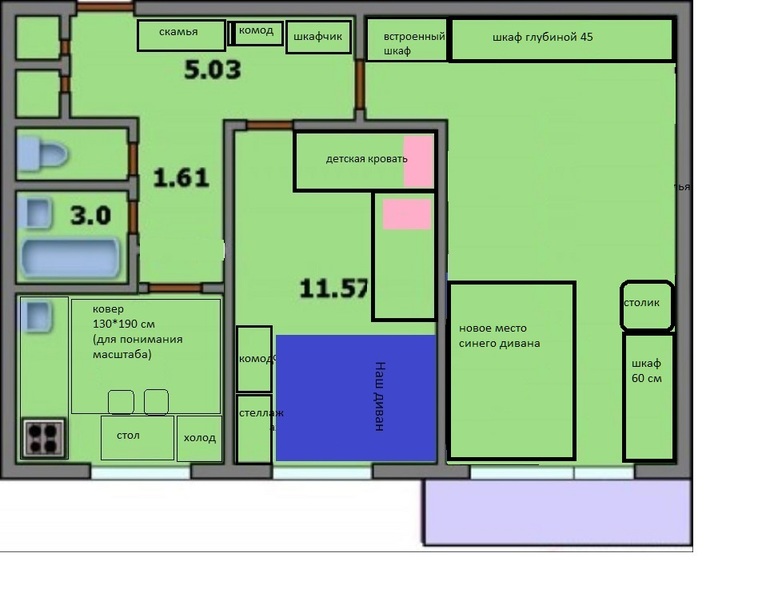 А если серьезно, практически вся эта мебель переехала с нами из однокомнатной! квартиры в 38 метров, угловой диван жил на кухне, нынешняя мебель из детской и коридора прекрасно помещалась в коридоре, но сейчас не об этом.