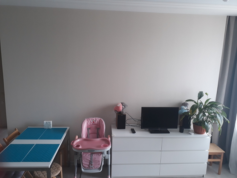 У нас есть кухня-гостиная. Планирую сейчас стеллаж под тв. Для него есть отдельная стена. Но по ней стоит обеденный стол.