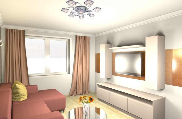 Авторские проекты дизайнеров.(Посты не по теме будут удаляться!)Одной молодой семье захотелось свою спальню видеть именно как гостиную - с большим угловым диваном и , конечно, телевизором.