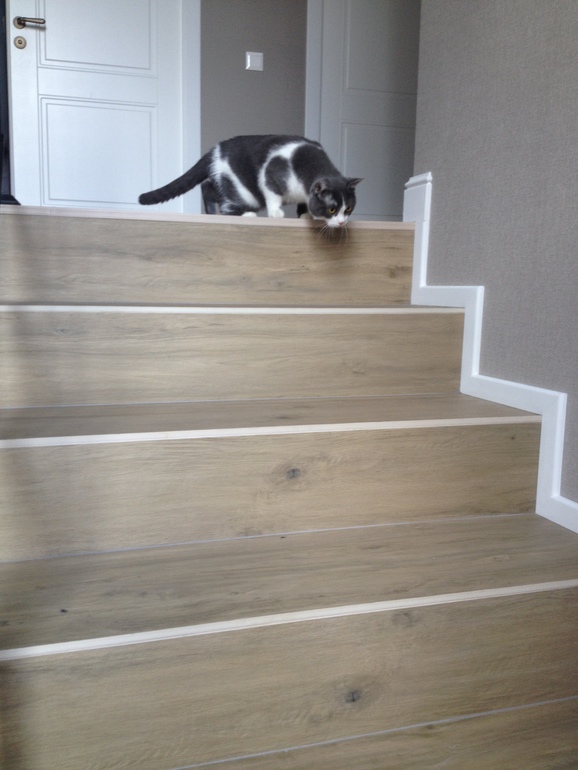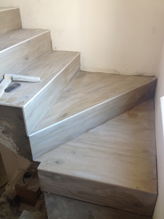 Да затирка, сверху ступеней светлые полосы это край верхнего керамогранита, я не придумала чем их затемнить. У нас лестница была уже в доме залита, керамогранит с работой стоил 40000 руб., примерно.