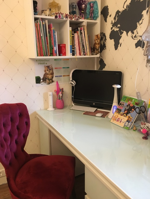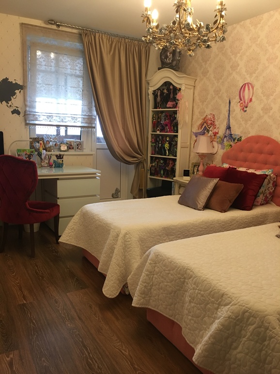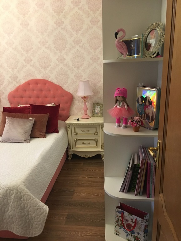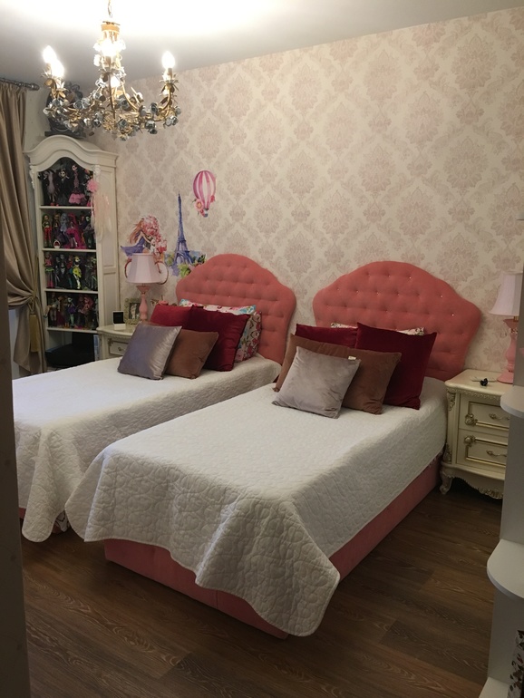 Комната для дочки 12 лет. Почему вторая кровать? Причины для ее присутствия есть, но через годик уберем ее, поедет на дачу. Интересно мнение по поводу текстиля...удачно ли все подобрано или не совсем, замучалась с подушками=)) Никак не найду сочетание цветов. Шкаф-купе купили временный, т.к. устали от вещей в коробках, а тем более школа была на носу, неудобно. И доделать плинтус осталось. Люстра тоже временная будет потом из одной серии с настольными лампами. Надеюсь, в целом, получилось не плохо.