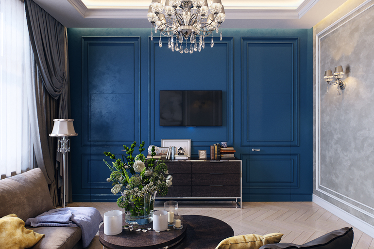 Синяя стена задала динамику нашему классическому интерьеру. Цвет добавил уюта и, как мне кажется, не уменьшил площадь комнаты, а придал дополнительную глубину и объем помещению!