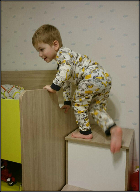 Кровать делалась по заказным меркам. 170*80 см. Штатная 80*200см. 2 метра не нужны были ни 3хлетнему Данику, ни мне, ни интерьеру комнаты по электронному плану, который мне уже снился в страшных снах за 3 года планирования. Сейчас ни капли не жалею, т.к. сама чудесно на ней умещаюсь рядом с Даником или когда хочу ото всех выспаться. А ему еще запаса более чем. Высота дна кровати от пола 1,20м. Оптимальная высота для ребенка от 2 лет. На ярусе не душно, не жарко, высокий борт защитит от падения даже самого вертлявого, а окошки позволят маме с комфортом произвести все необходимые манипуляции: погладить, обнять, дать лекарство, поправить одеяло и т.д. Ничего общего с кроватями 1,7м. Но матрас все же я выбрала 10 см высотой, т.к. высота матраса съедает высоту бортов. Кровать выдерживает до 100 кг веса, так что и я, и наш папа не против поваляться с Даником в его покоях)))) Даже с 39недельным пузом я не могла себе отказать в этом)))