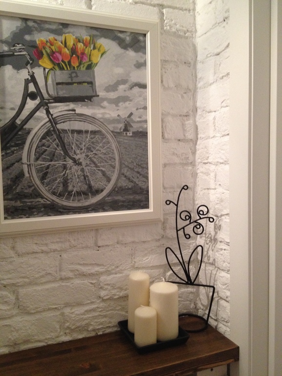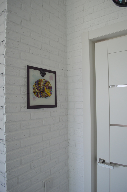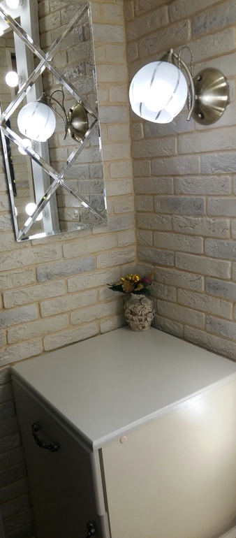На кухне часть стен выложена гипсовой плиткой.Покупали в Леруа,самую недорогую.Около 400 р квадрат.Хрупкая на самом деле только в коробке,а на стене все замечательно.Красила сама,вот с этим повозилась конечно.Но результат меня радует.)))