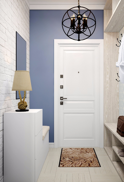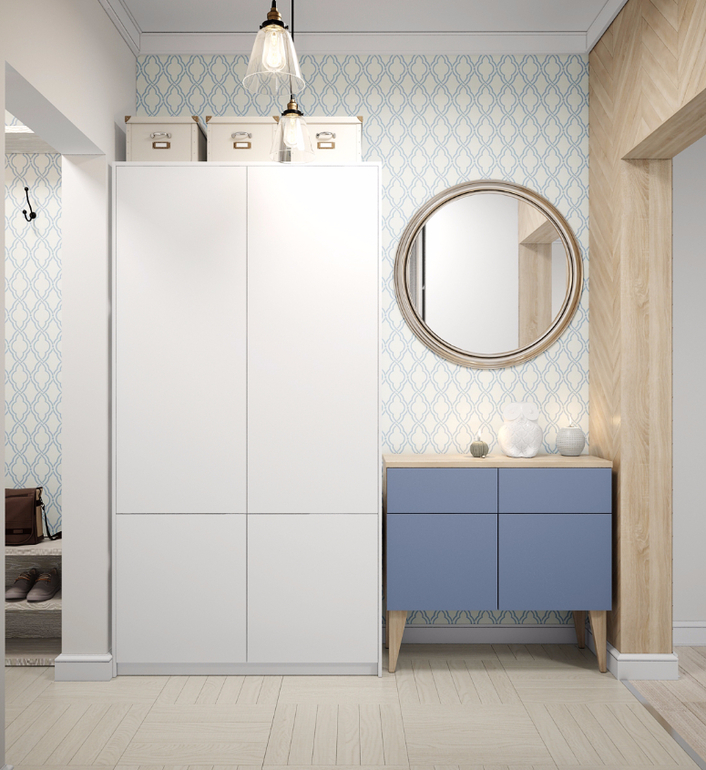 Так как, квартира захватывает часть общей площадки на этаже, то у нас получилось две прихожих. В первой, по желанию заказчиков, разместили открытую вешалку и полки под обувь, с противоположной стороны - банкетка с тумбой. Во второй два шкафа (вещевой и хозяйственный) и интерьерная консоль.