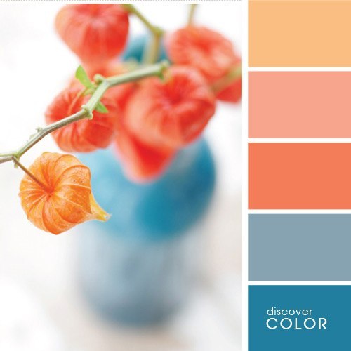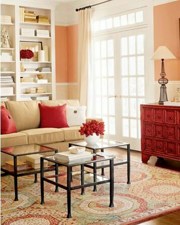 Цвет на самом деле удачный, только окружение ему нужно подходящее. Даже в пасмурную погоду жизнерадостно смотрится. Не надо голубое, они с коралловым почти дополнительные, в таких количествах даст слишком драматический контраст. И красные шторы на мой взгляд не самый удачный вариант. Но красные детали меньшего размера будут хорошо смотреться. На фото из вашего примера очень симпатичное сочетание. Я бы текстиль весь делала кремовым, белым или светло-бежевым. Диван светло-серый, бежевый. Возможно где-то использовать и паттерны ярких тёплых оттенков на светлом фоне. Где-нибудь пристроила бы белую шкуру небольшую. Немного черных акцентов в виде ножки торшеров, карниза и т. п.