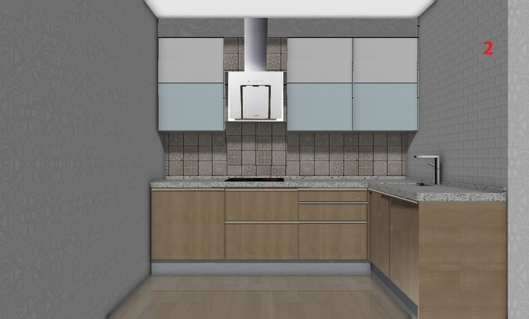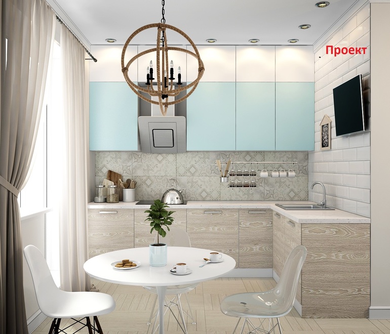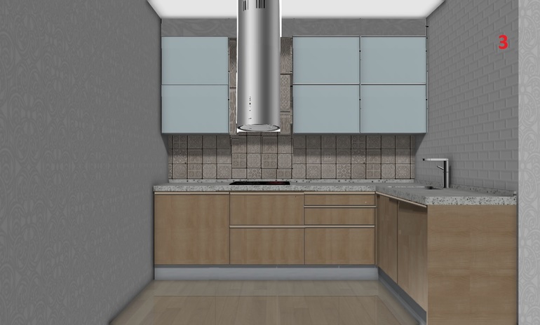Эта наша кухня по проекту, нарисованная в одном из салонов. Решили попробовать посчитать кухню в разных местах. Там стали вносить предложения, указывать на недостатки, какие есть по их мнению . Возникли сомнения разного характера. Стало как-то жалко, что нет ящиков выдвижных совсем. Можно сделать какие-то скрытые, но это не удобно, говорят. И верхние шкафы стали смущать (хотя мы сами просили до потолка))). Говорят, вытяжка зажатая получается. Либо ее вообще встроенную сделать, либо как-то разгрузить сверху? В общем хочется оставить цветовую гамму, низ и колонны - шпон, а верх - голубой с белым. Взгляните пожалуйста, тут варианты по проекту, варианты кухонных салонов и сама я налепила что-то.