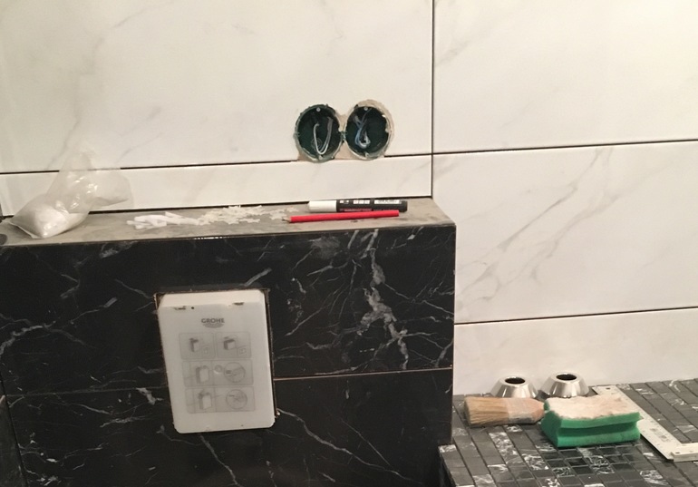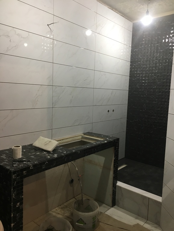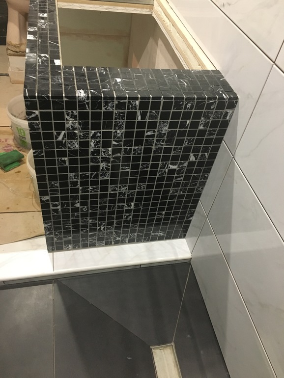 Кстати вылез мой первый ремонтный косяк, а именно я сначала отмеряла высоту короба под инсталляцию, сказала работнику делать короб пол неё именнно той высоты, которую мне надо и уже после этого купили плитку, в итоге получилась вставка из подрезки над коробом, ладно хоть на очень узкая, поэтому не повторяйте моих ошибок))