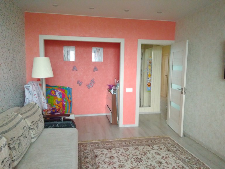 Подумали с супругом и уже думаем перевесить телек на другую сторону, а кровать в противоположную. Или вообще кровать в нишу запихнуть, а напротив телевизора диванчик уютный.