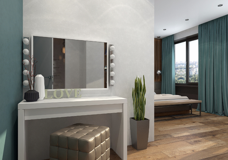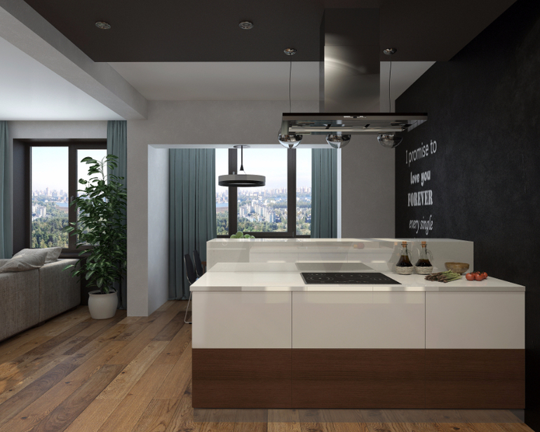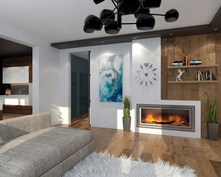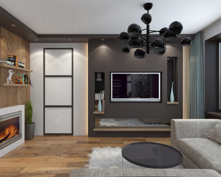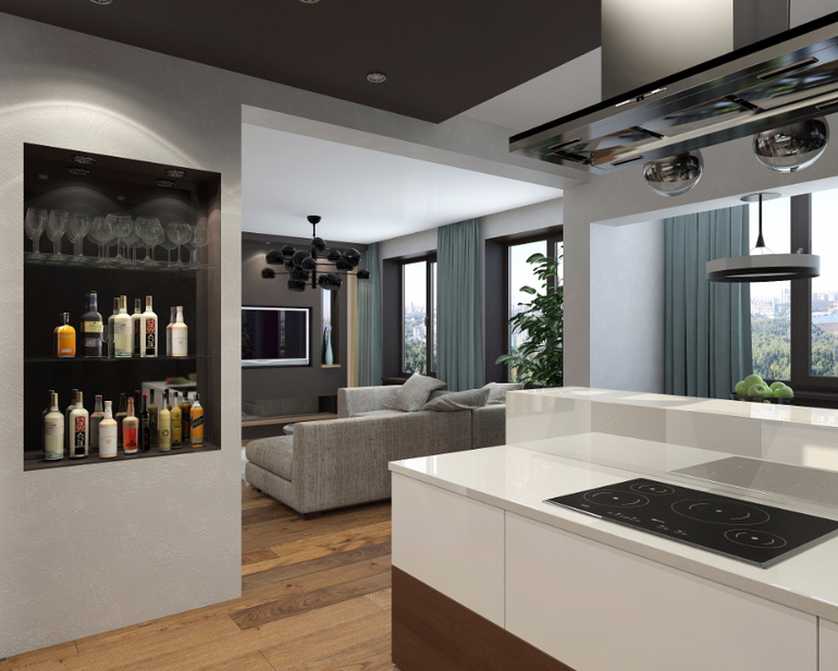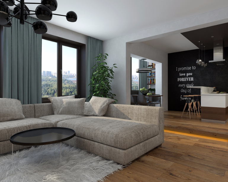 Пара очень молодая, детей пока нет. Часто в гости приходят друзья и устраиваются вечерние посиделки, для этого зону гостиной и кухни решено было превратить в единое пространство, причем на предыдущих вариантах планировки были предложения разделить эти зоны раздвижными перегородками, но в итоге мои клиенты отклонили такое предложение.