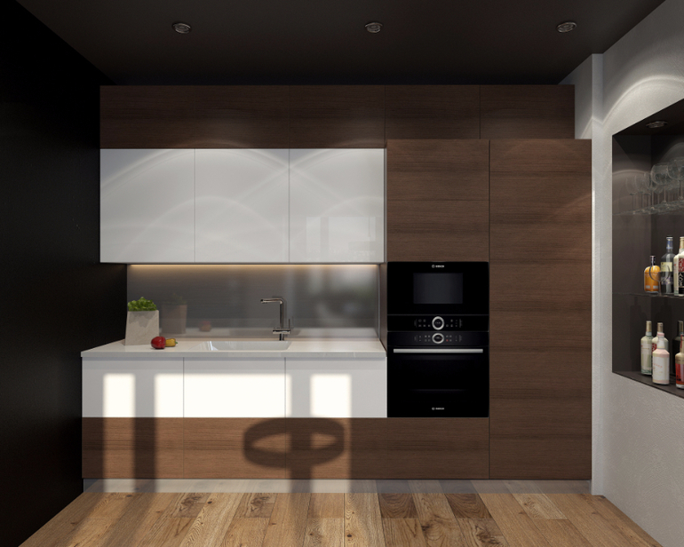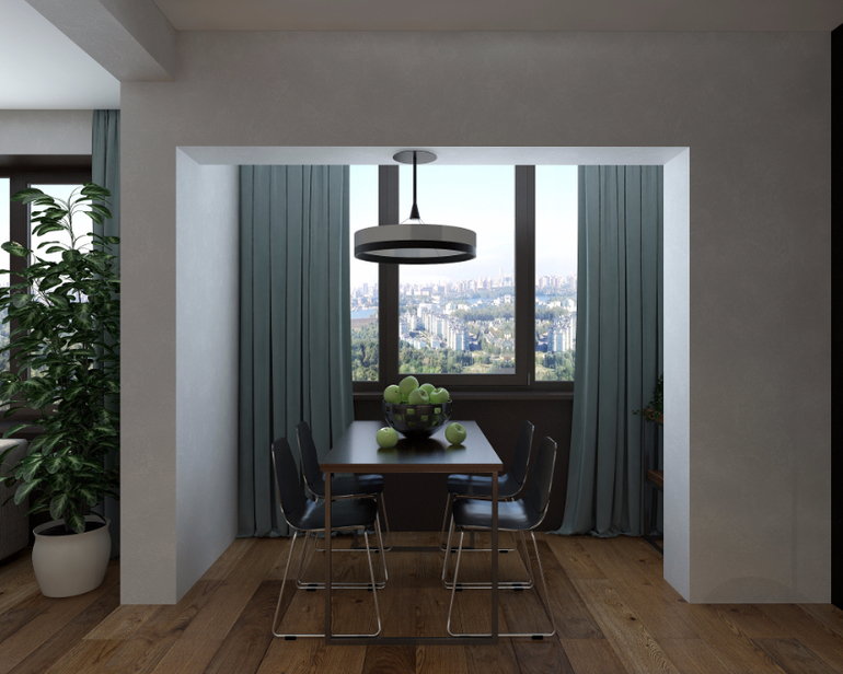 Её окна выходят прямо на Москва-реку, поэтому столовую зону решено было вынести в зону балкона и поднять пол в кухне на 15 см от чистового пола всей квартиры - получился подиум с подсветкой.
