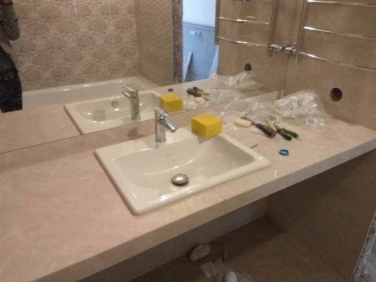 Мы тоже в ванной столешку сделали,я очень долго выбирала из чего? И в итоге сделали из плитки,но у нас сама плитка на стене керамогранит крутая, размер плитки одной 30*90 см. столешка смотрится как из мрамора. Агломерат дорого и выглядит хуже, на мой взгляд.