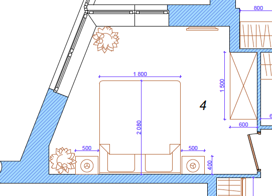 Планировка спальни вот такая, т.е. осноная стена - за кроватью, остальные почти целиком стены завешены-заставлены: