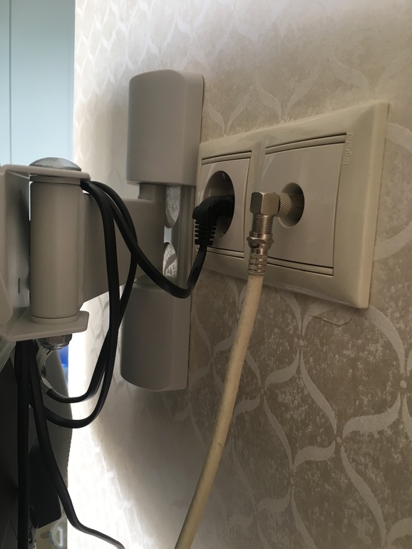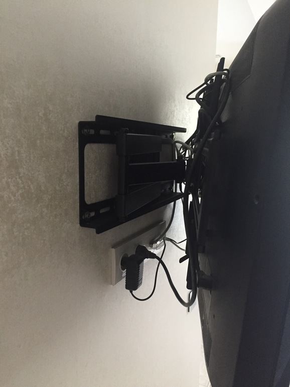 Мы сначала вывели пилот (сам провод замурован в стене) и рядом с пилотом кранштейн.ничего за телеком не видно.