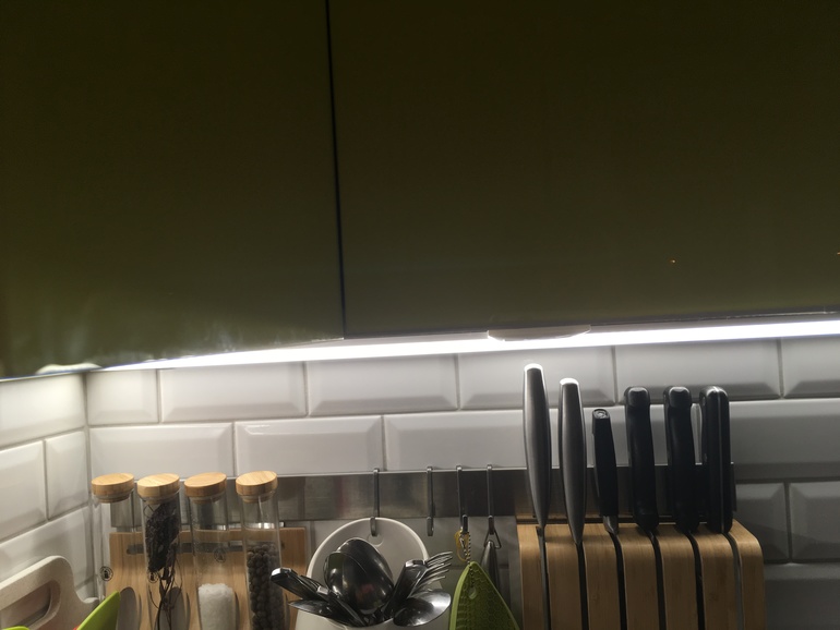 К дну верхнего шкафа обычную плоскую накладную. И дешево и практично. Для выдвижных надо много пространства и цена немаленькая