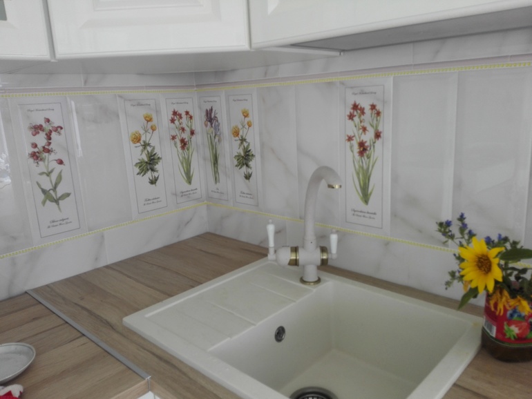 Очень красивая и стильная получилась у Вас кухня, столешница тоже очень подходит под Вашу напольную плитку. Подскажите, а где Вы столешницу заказывали?